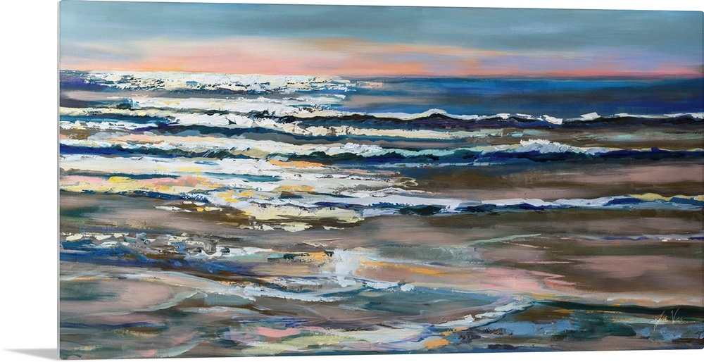 <p>A landscape painting of waves on the ocean being caught by the sunlight</p>