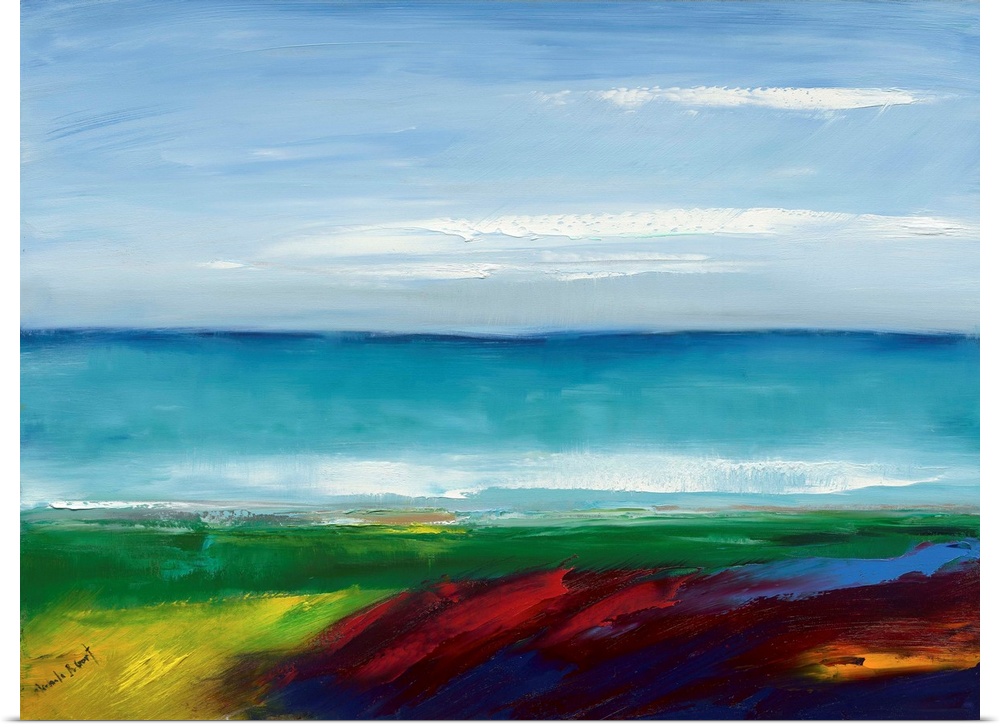 <p>Contemporary abstract painting representing a coastal landscape with bold colors.</p>