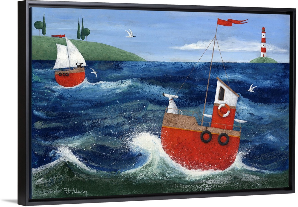 <p>Contemporary painting of a white dog on the front of a red boat sailing on the sea.</p>