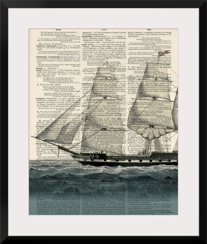 <p>Contemporary artistic use of a page from a dictionary with a ship sailing on the water on top of the text.</p>
