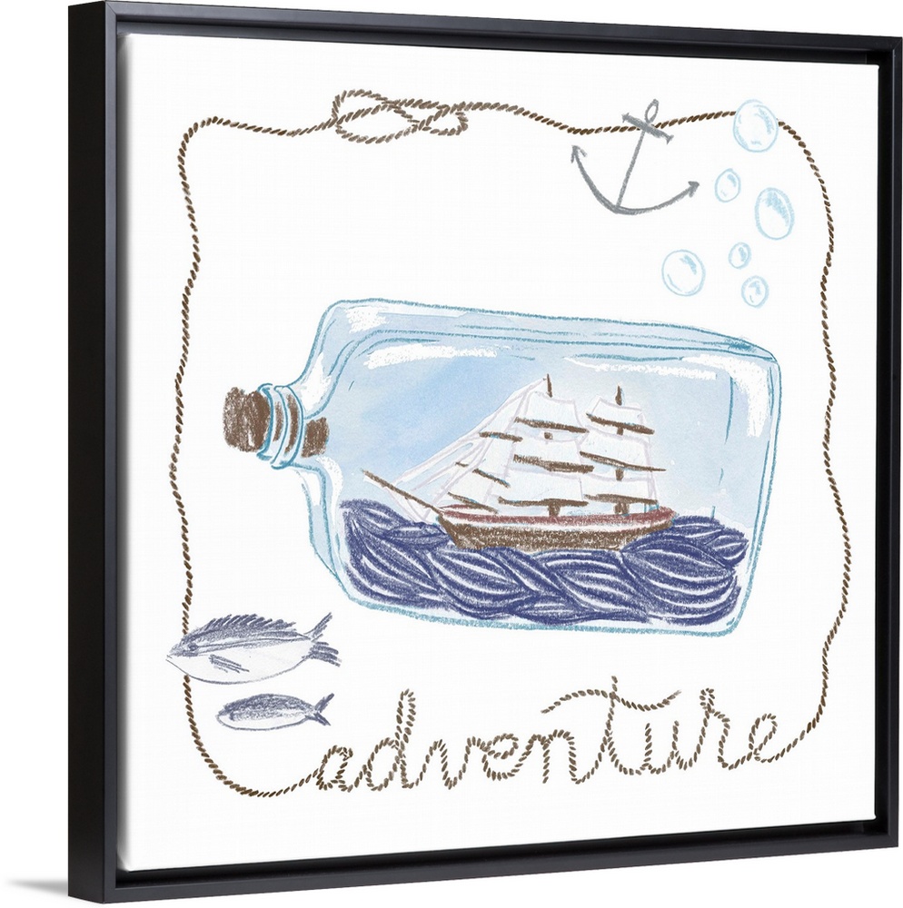 <p>Illustration of a sailing ship in a bottle with a rope reading "Adventure."</p>