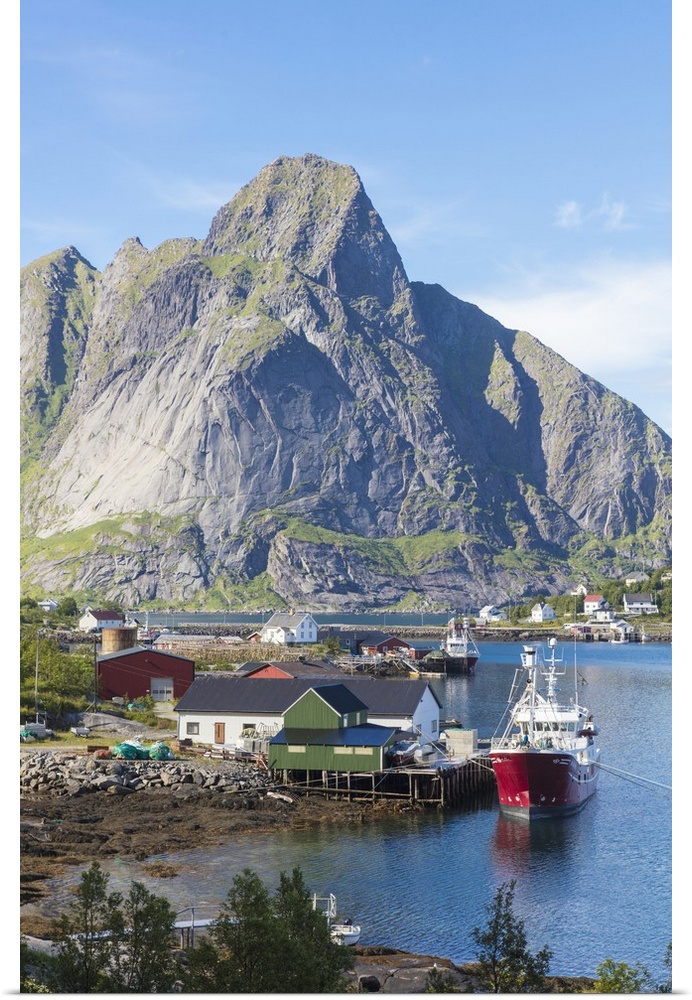 <p>Ship in the blue sea frames the fishing village and the rocky peaks, Reine, Moskenesoya, Lofoten Islands, Norway, Scandinavia, Europe</p>