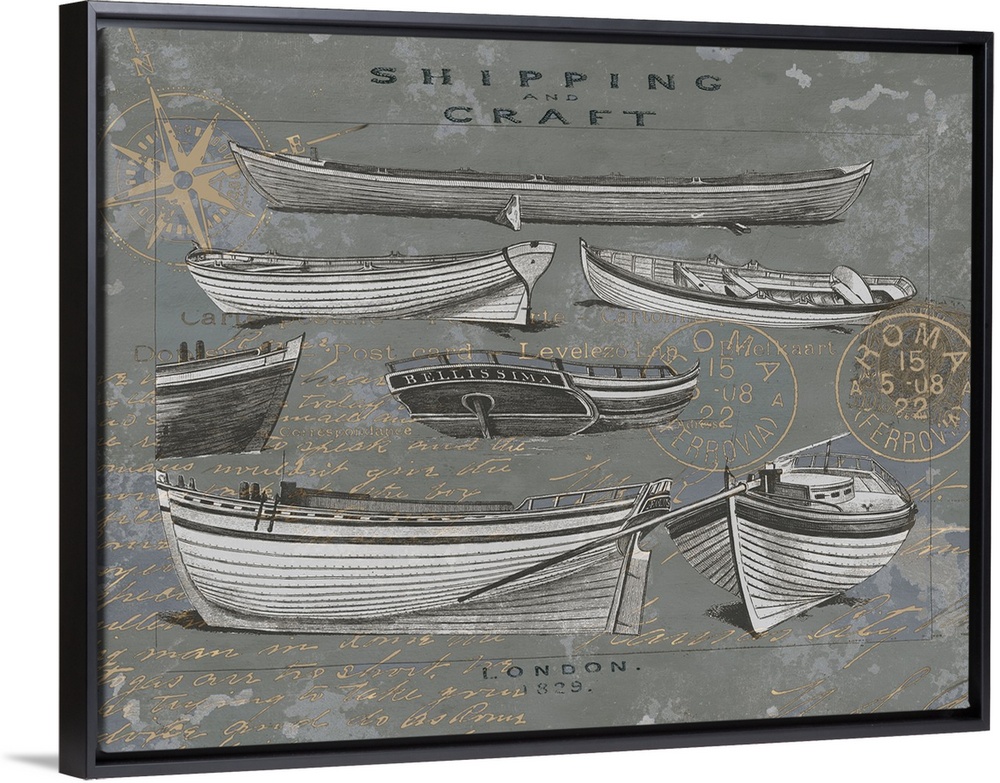 <p>Illustration of different shipping boats and craft on an aged background with gold script and stamps.</p>