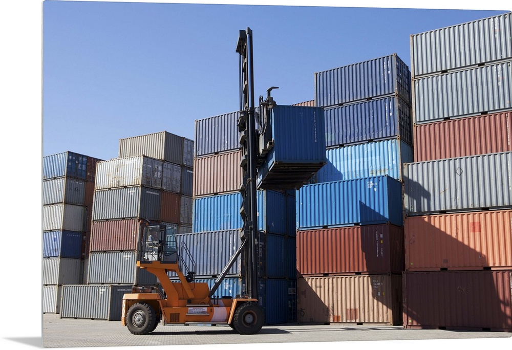 <p>Shipping container being moved by an industrial top-loader crane in a modern container facility</p>