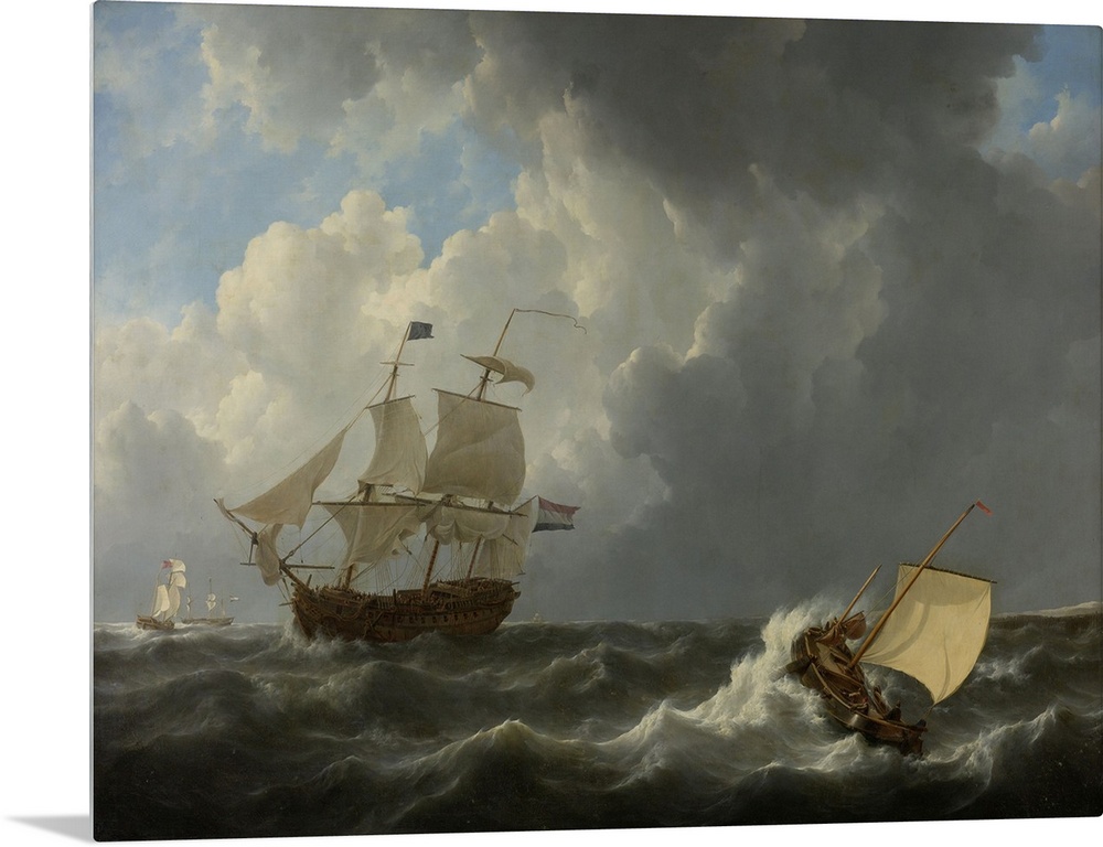 <p>Ships in a Turbulent Sea, by Johannes Christiaan Schotel, 1826, Dutch painting, oil on canvas. Four ships in rough sea, with a Dutch warship in the foreground.</p>