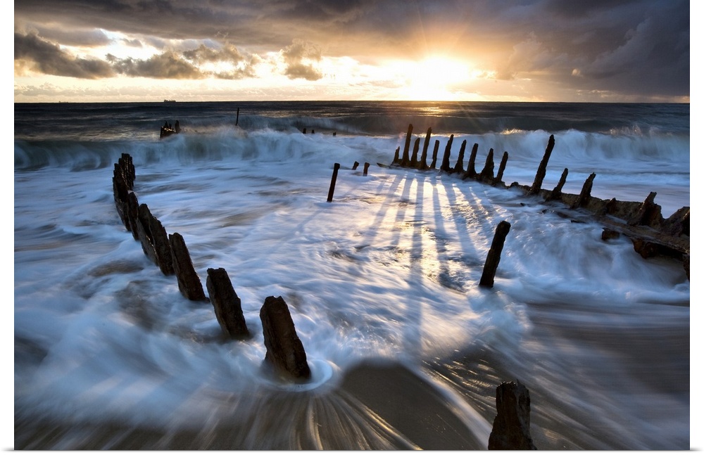 <p>Remains of an abandoned boat on the beach with waves at sunset.</p>