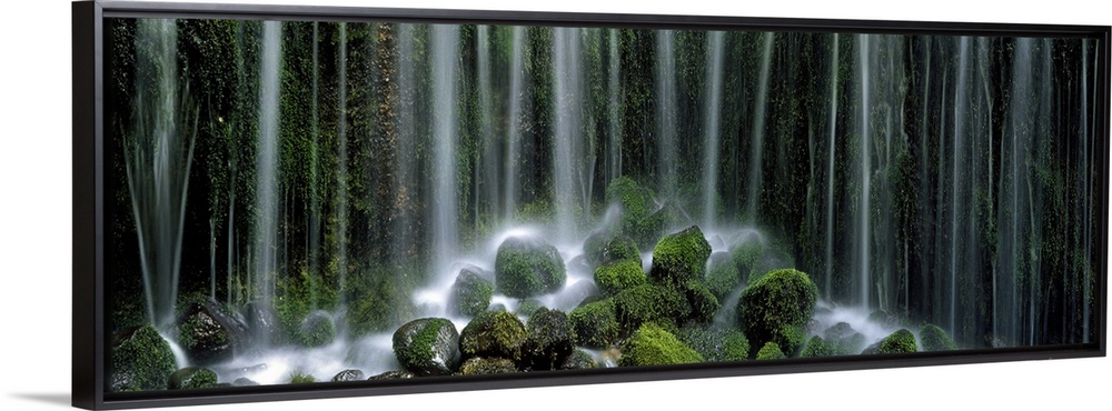 <p>Panoramic photograph displays a gathering of large rocks covered in moss as the waterfall above crashes into and splashes off them.</p>