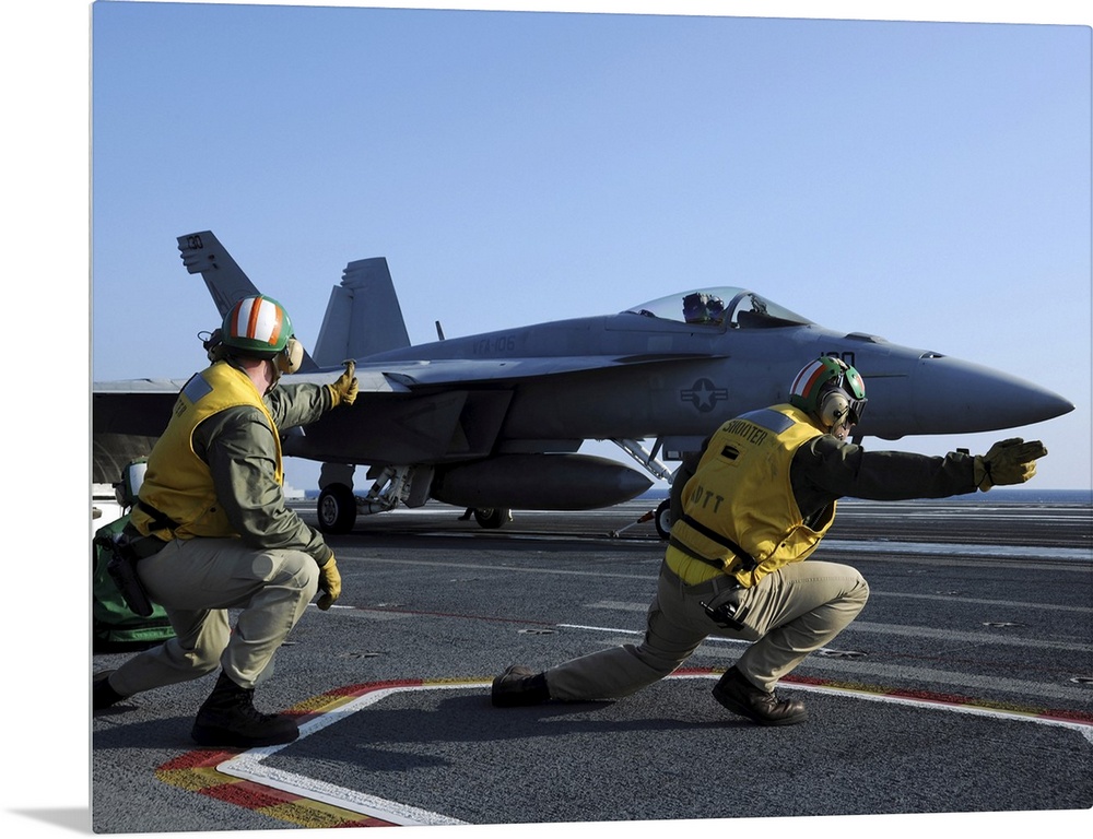 <p>Atlantic Ocean, March 15, 2010 - Shooters aboard the aircraft carrier USS George H.W. Bush (CVN-77) give the go-ahead signal to launch an F/A-18 Super Hornet.</p>
