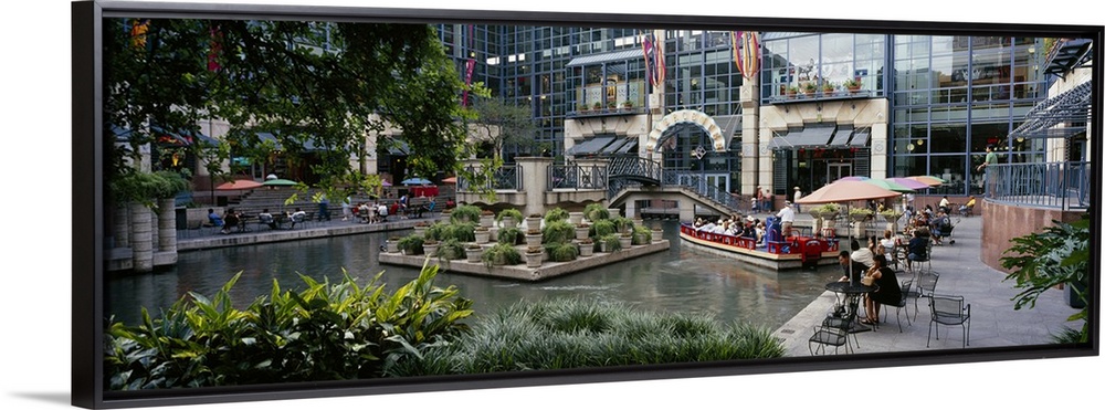 <p>Oversized photograph on a horizontal canvas of the Rivercenter mall in San Antonio, Texas. A small boat floats through the courtyard in the mall, part of the San Antonio River Walk.</p>
