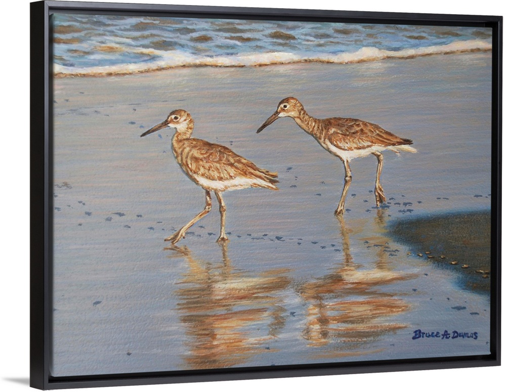 <p>Contemporary painting of two sandpipers walking along the shoreline.</p>