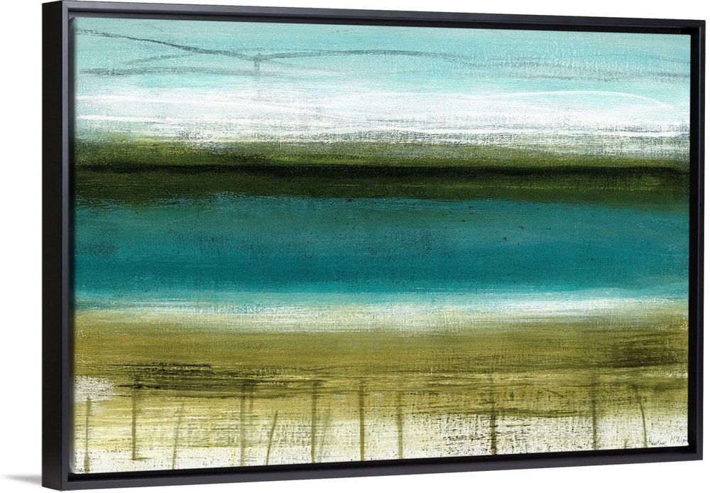 <p>A modern abstract landscape of a beach scene in bold brush strokes of gray, green and blue.</p>