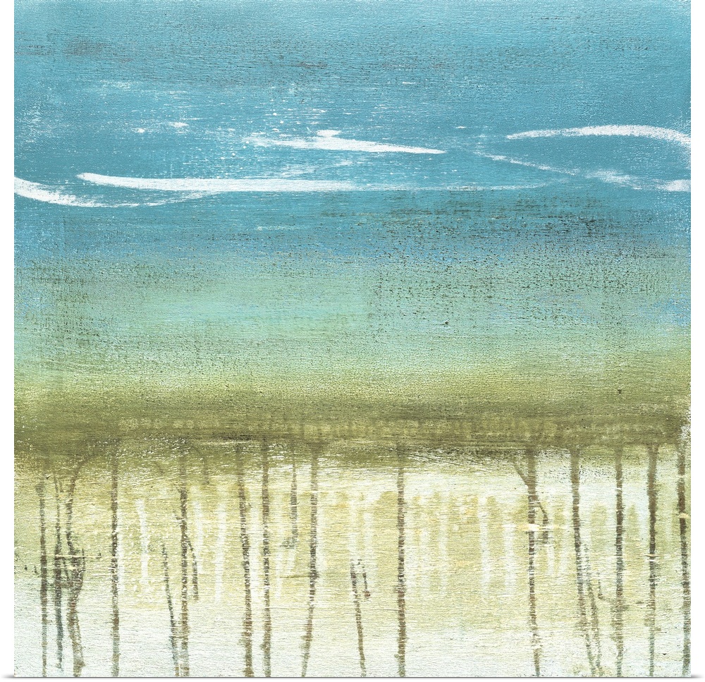 <p>A modern abstract landscape of a beach scene in bold brush strokes of green and blue with drips of gray below.</p>