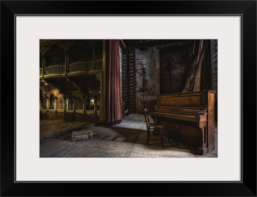 <p>A derelict theatre with an old piano and chair on stage.</p>