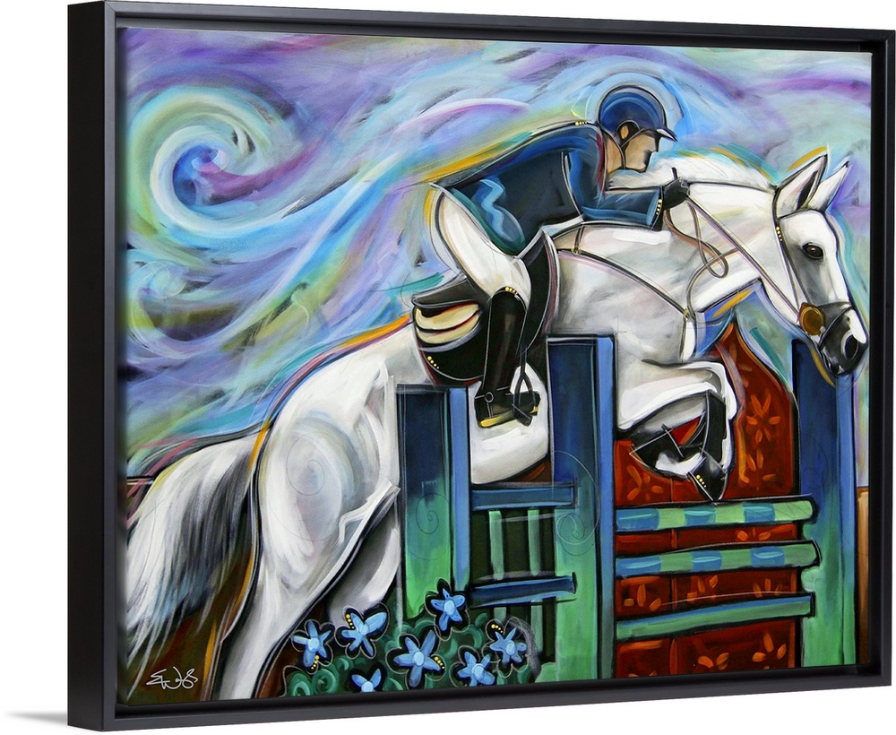 <p>Contemporary painting of a rider jumping a white horse over a green fence.</p>