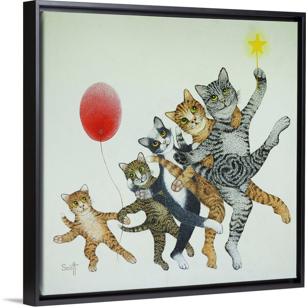<p>Illustration of five cats dancing in a line, with a red balloon.</p>