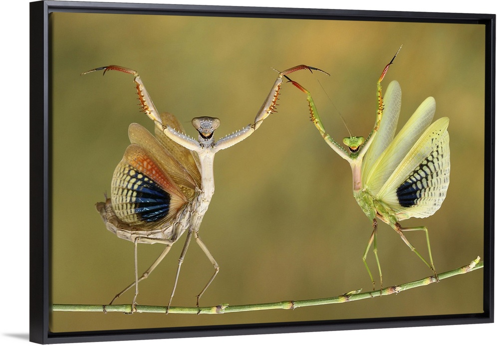<p>Two Praying Mantises raising their forelegs and spreading their wings on a branch.</p>