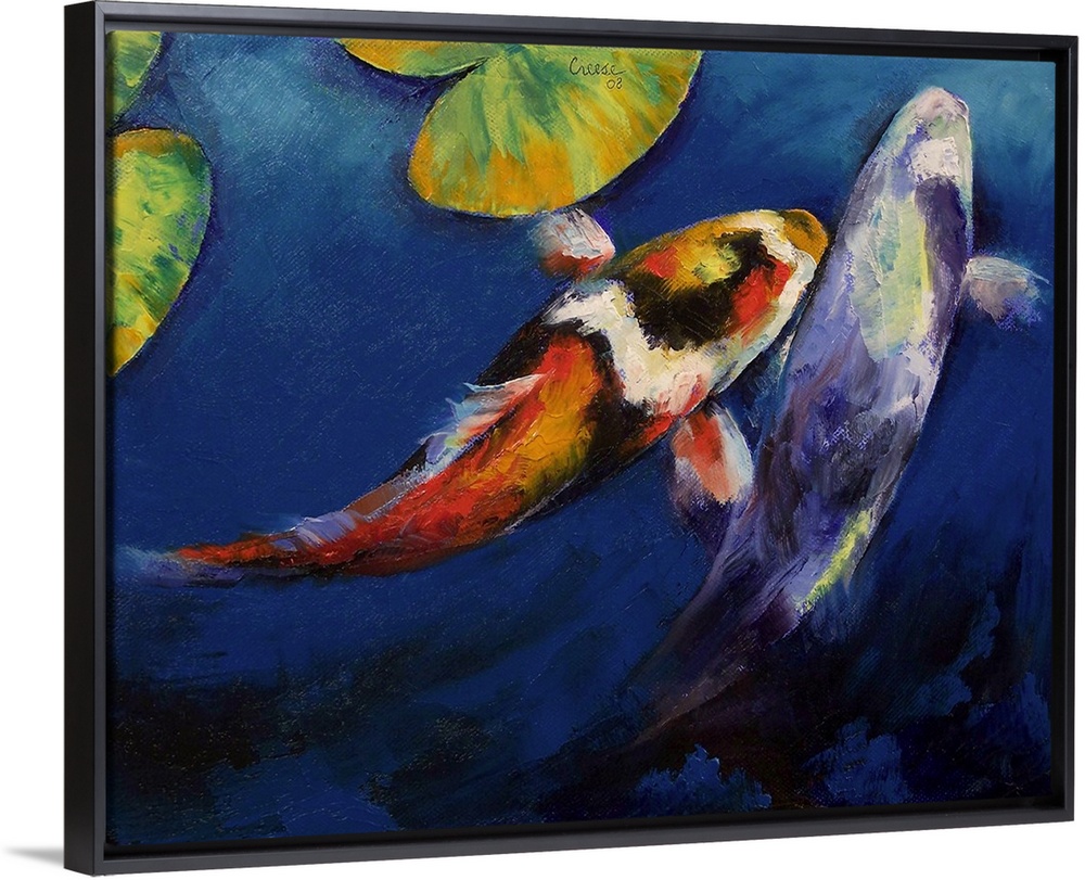 <p>This painting depicts two koi fish. It is rendered with an impasto technique for beatuful, stained glass color effects, by koi artist Michael Creese.</p>