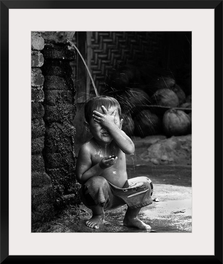 <p>A young boy sits under a stream of water in the village of Sade, Lombok, Indonesia.</p>