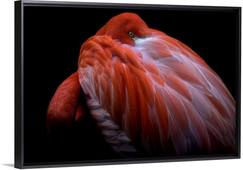 <p>A Caribbean Flamingo with its head buried in its feathers, with just its eye visible.</p>