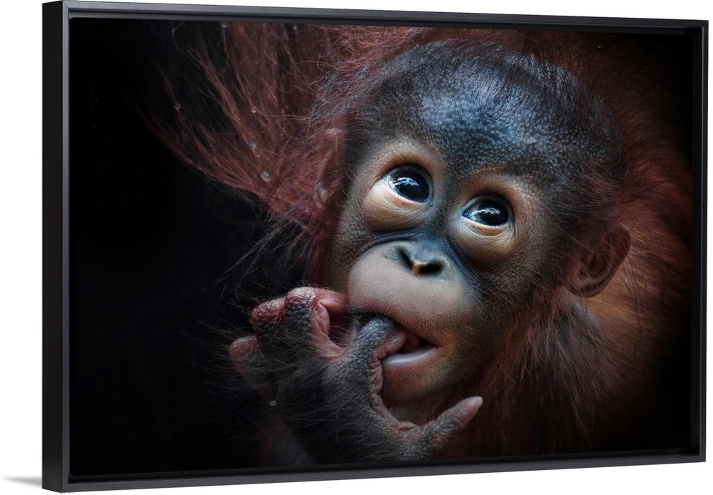 <p>A baby orangutan with its finger in its mouth.</p>