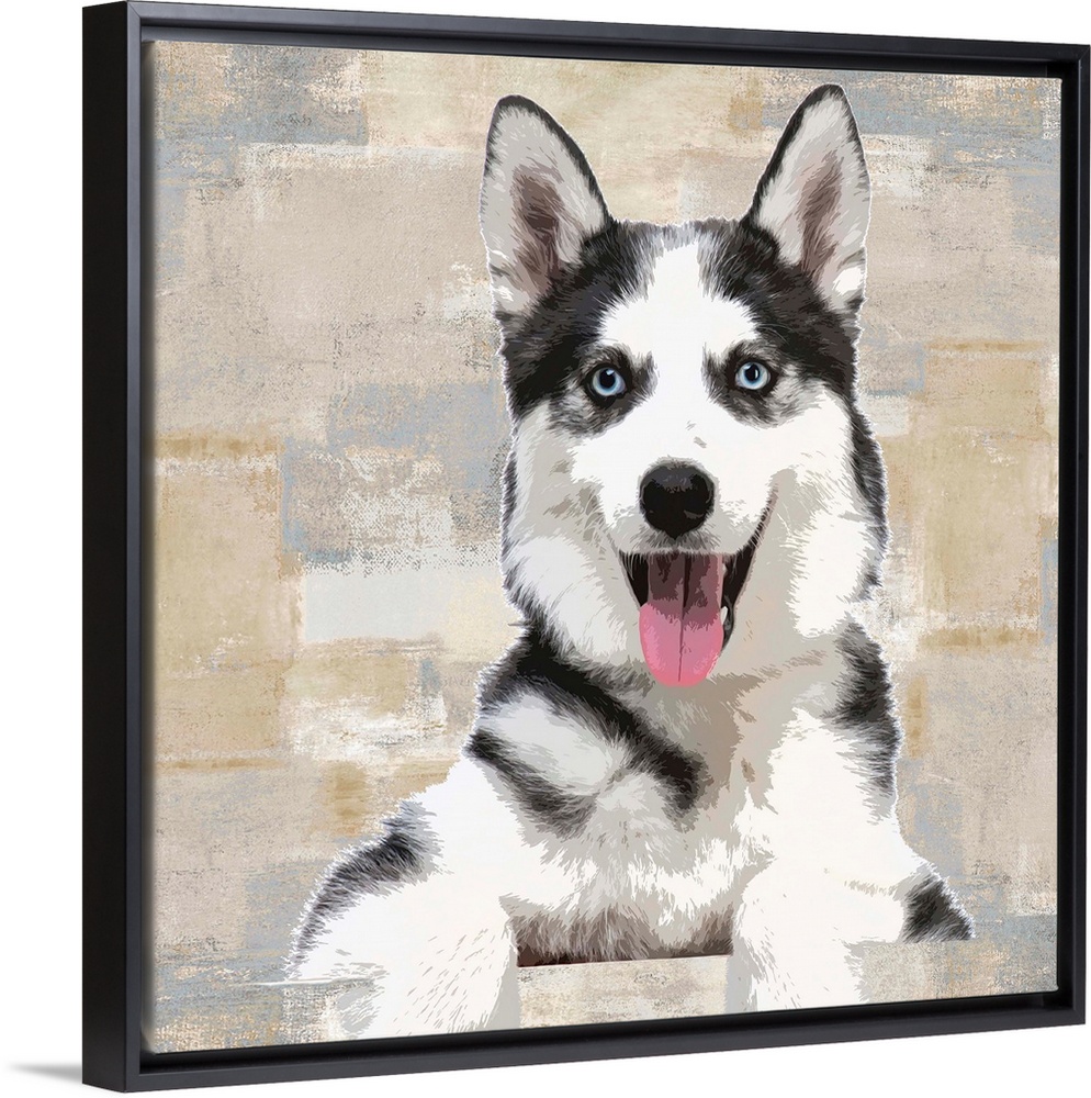 <p>Square decor with a portrait of a Siberian Husky on a layered gray, blue, and tan background.</p>