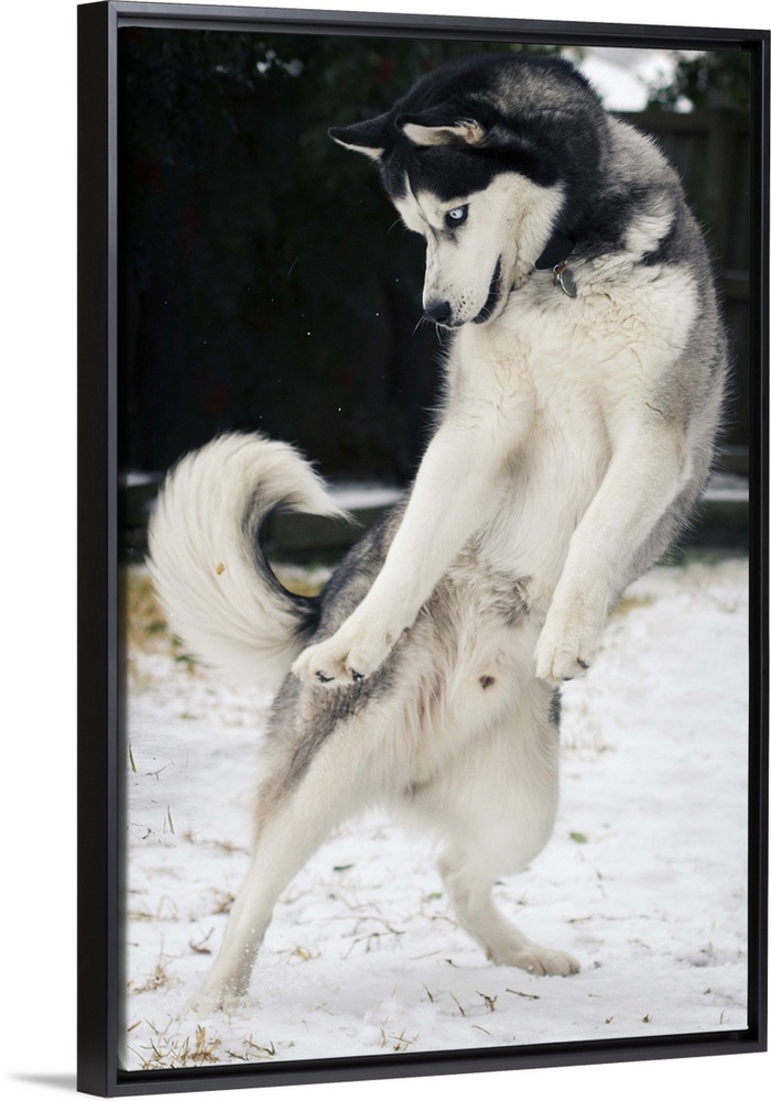 <p>Siberian Husky jumping and playing on snow.</p>