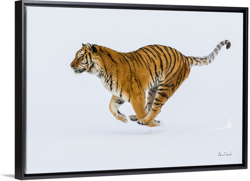 <p>SIBERIAN or AMUR TIGER (Panthera tigris tigris) leaping through the snow, Bozeman, Montana, USA.</p>