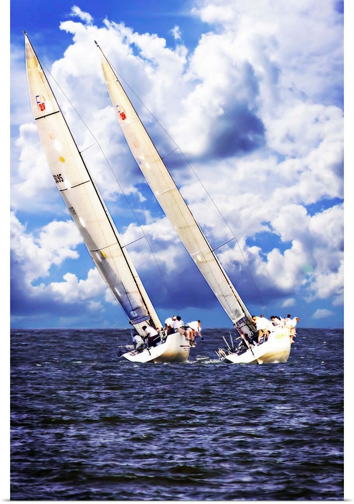 <p>Two sailboats on the water leaning against the wind with large clouds in the sky.</p>