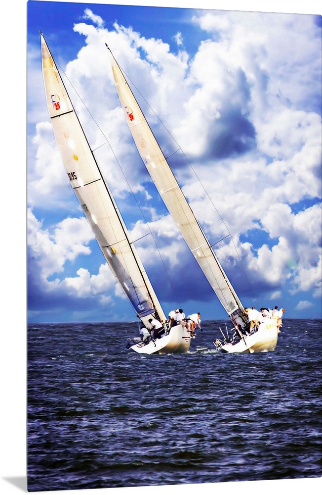 <p>Two sailboats on the water leaning against the wind with large clouds in the sky.</p>