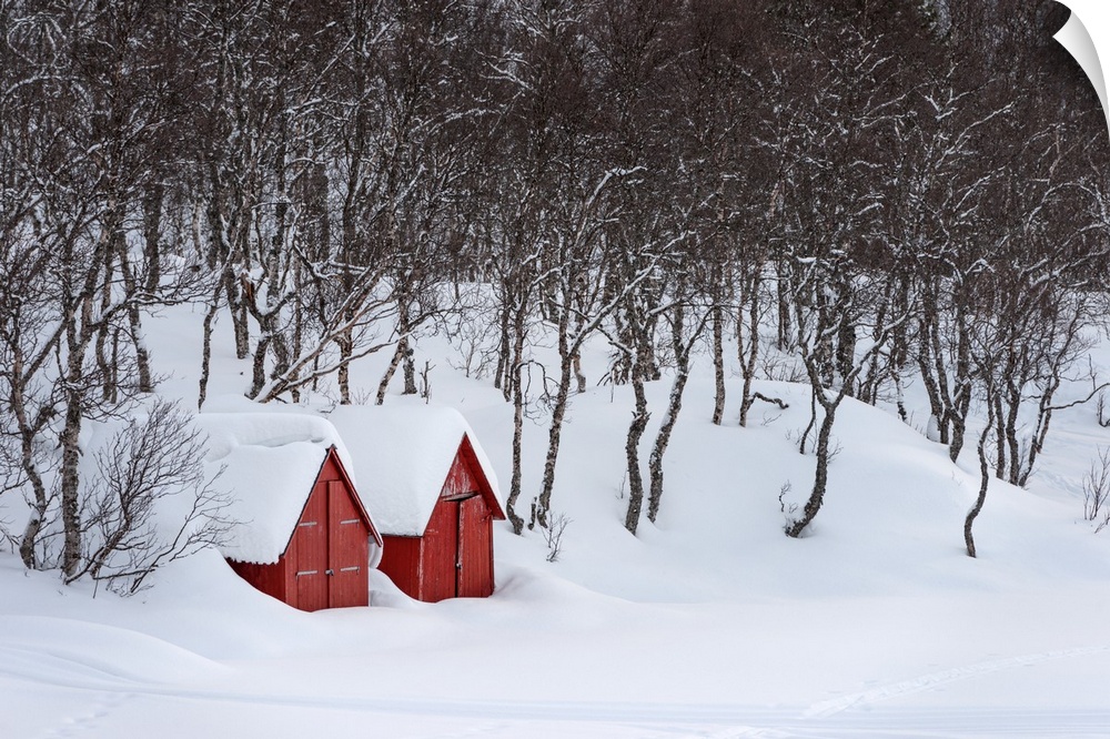 <p>A photograph of two red houses under a thick blanket of snow.</p>