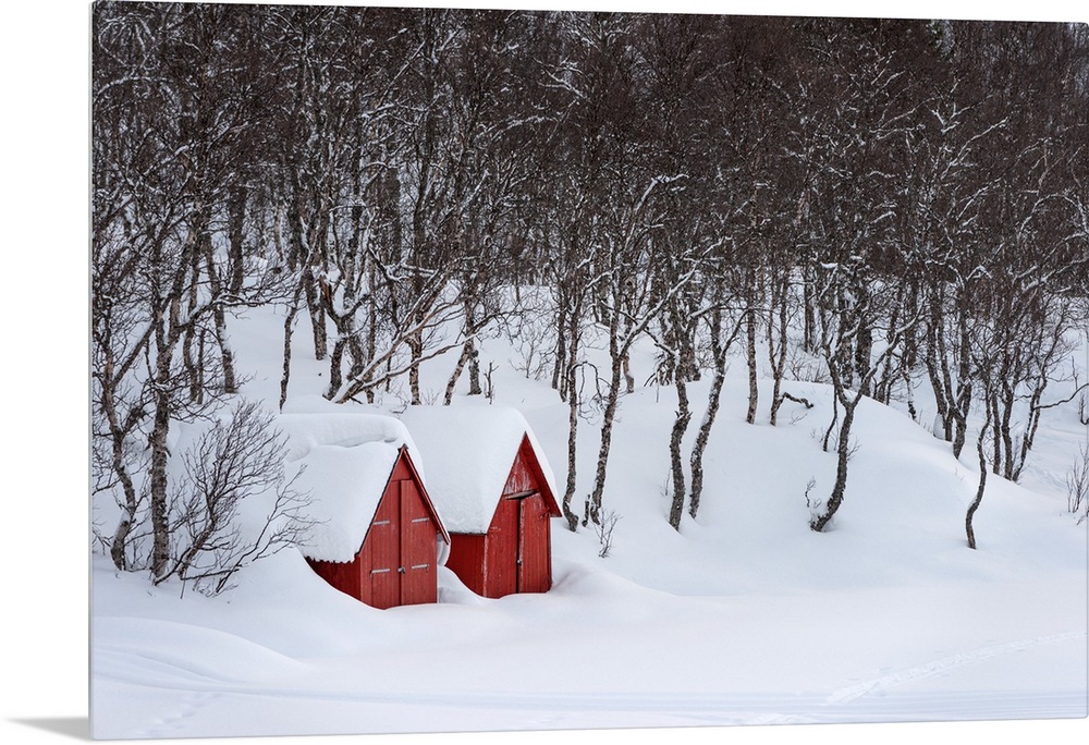 <p>A photograph of two red houses under a thick blanket of snow.</p>