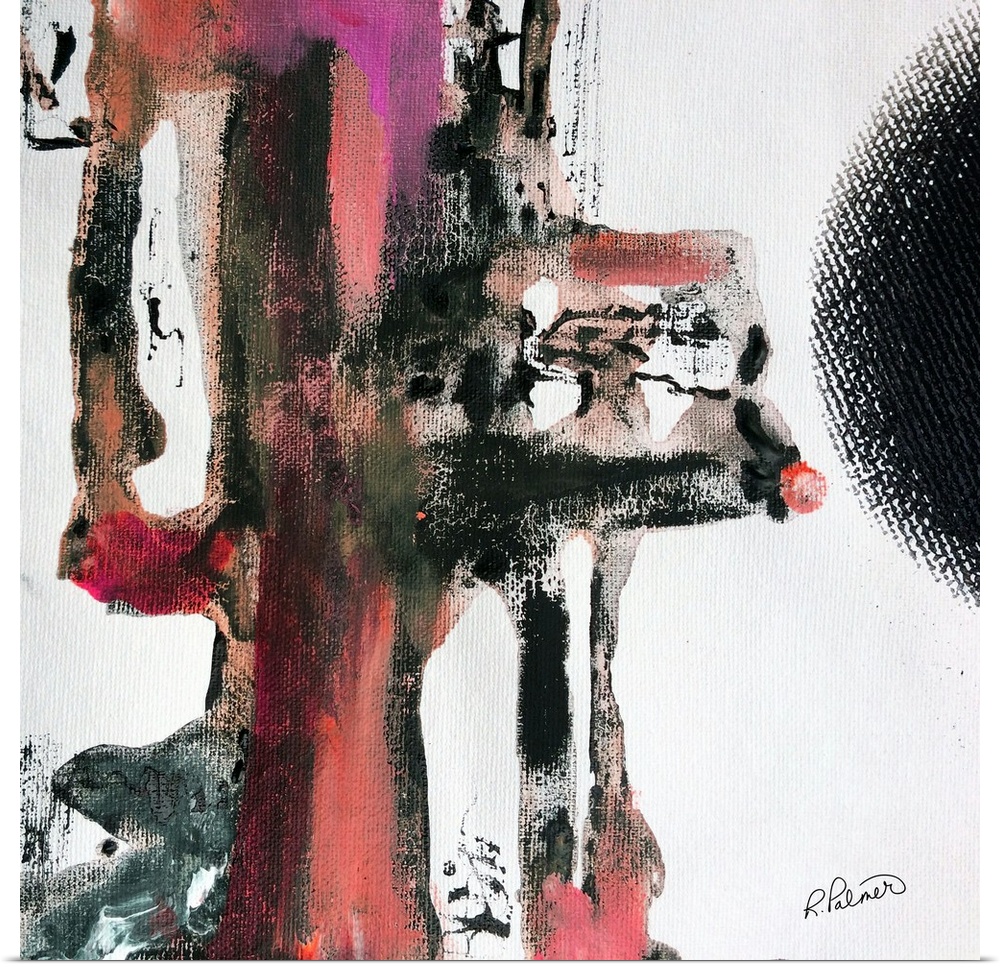 <p>Square abstract painting in shades of pink, red, black, and gray on a white background.</p>