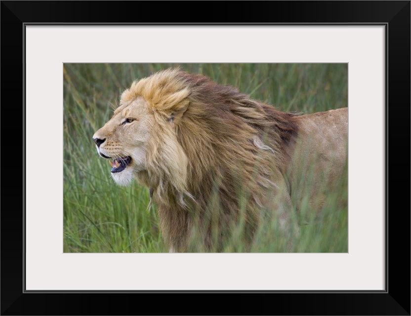 <p>Big photograph focuses on the nicknamed ""King of the Jungle"" as it stands by itself within a field of tall grass in Africa.</p>