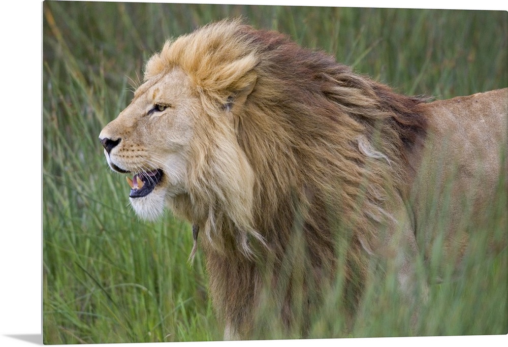 <p>Big photograph focuses on the nicknamed ""King of the Jungle"" as it stands by itself within a field of tall grass in Africa.</p>