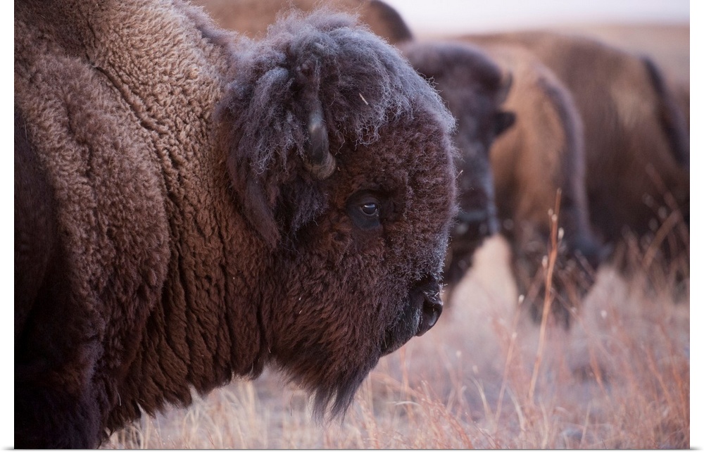 <p>Close-up of the side view of a bison head on a grazing on a field at a ranch near valentine, Nebraska, USA. Valentine, Nebraska, united states of America.</p>