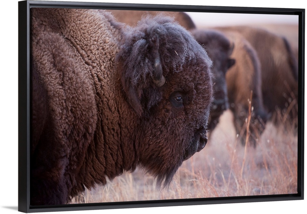 <p>Close-up of the side view of a bison head on a grazing on a field at a ranch near valentine, Nebraska, USA. Valentine, Nebraska, united states of America.</p>