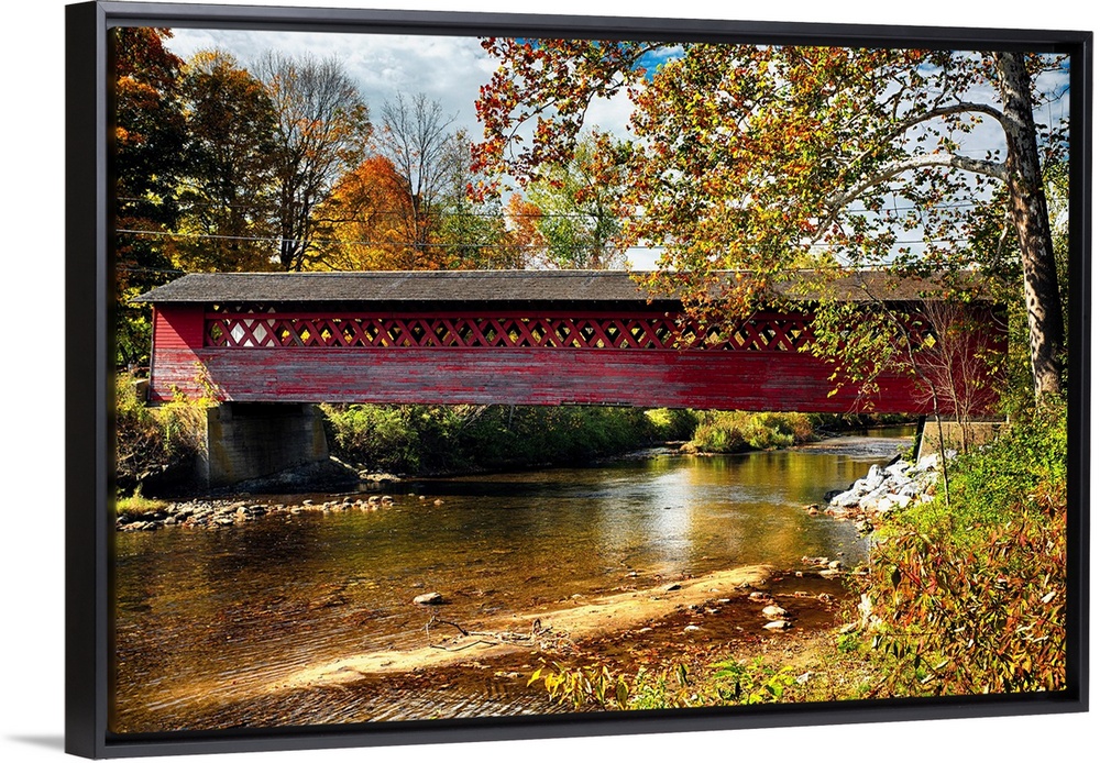 <p>Fine art photo of a historic covered bridge over the Waloomsac River in New England.</p>