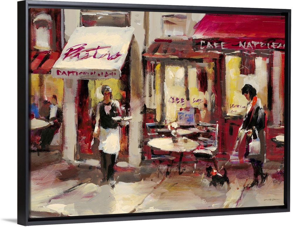<p>Contemporary painting of a woman walking along a sidewalk approaching a bistro.</p>