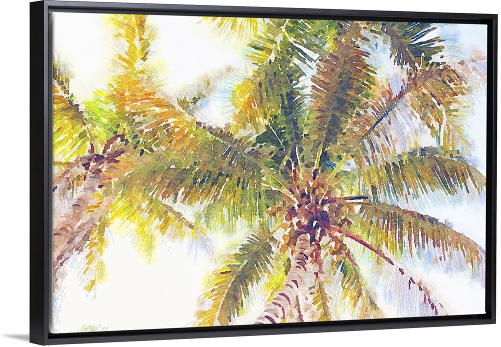 <p>Watercolor painting of tropical palm trees seen from below.</p>