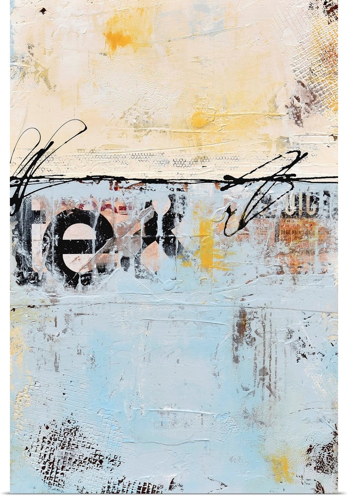 <p>A contemporary abstract painting using a neutral tone face to face with a pale blue and partially stenciled letters in black.</p>
