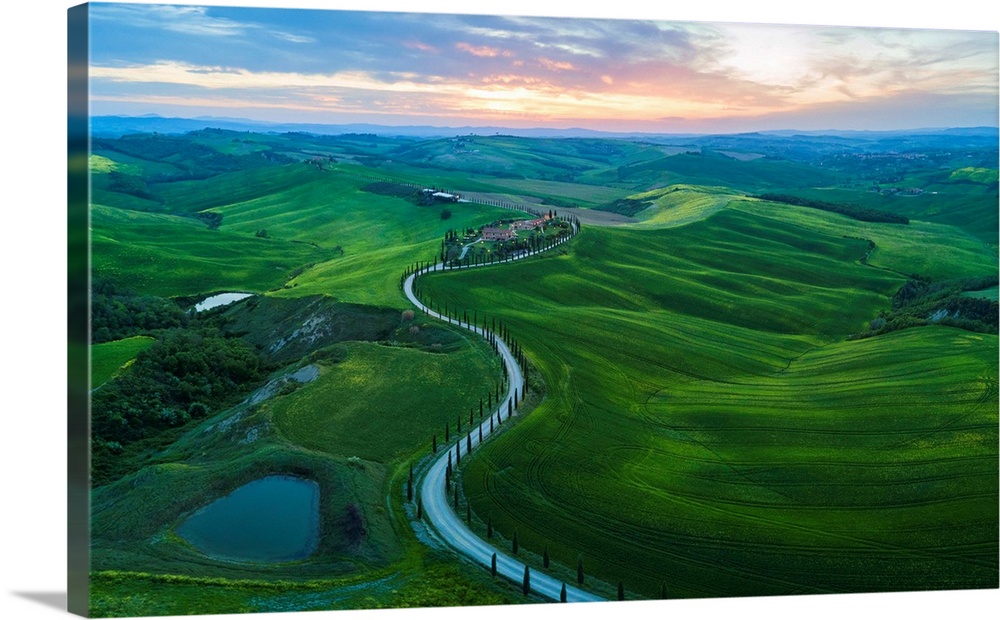 <p>Farmhouse Baccoleno, Asciano, Siena province, Tuscany, Italy. Aerial view during sunset of the Baccoleno farmhouse.</p>
