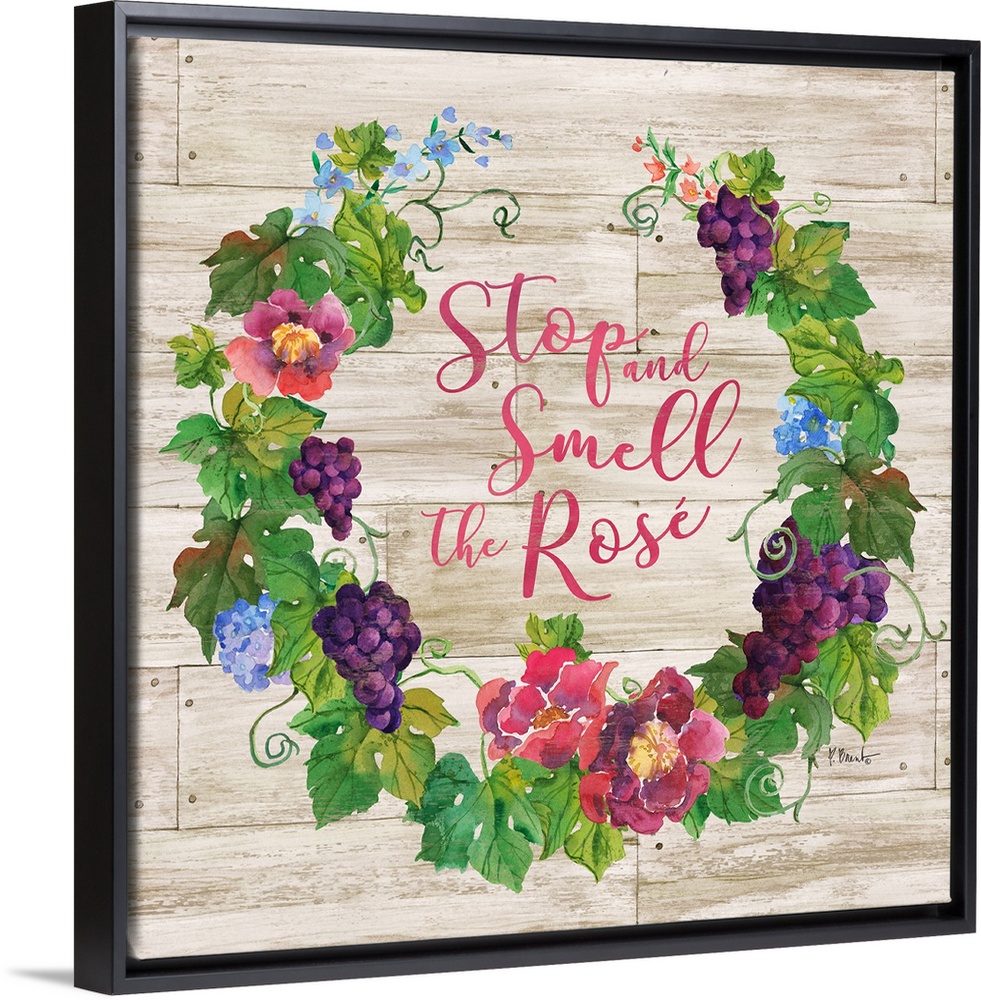 <p>"Stop and Smell the Rose" written in the center of a floral wreath with grapes on a faux wood background.</p>
