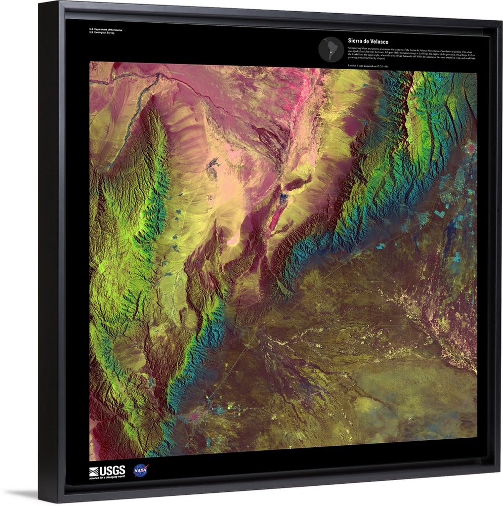<p>Shimmering blues and greens accentuate the textures of the Sierra de Velasco Mountains of northern Argentina. The urban area (pinkish circle) near the lower left part of the mountain range is La Rioja, the capital of the province of La Rioja. Follow the foothills to the upper right, where the city of San Fernando del Valle de Catamarca lies near extensive vineyards and fruit-growing areas (blue blocky shapes). February 28, 1985.</p>