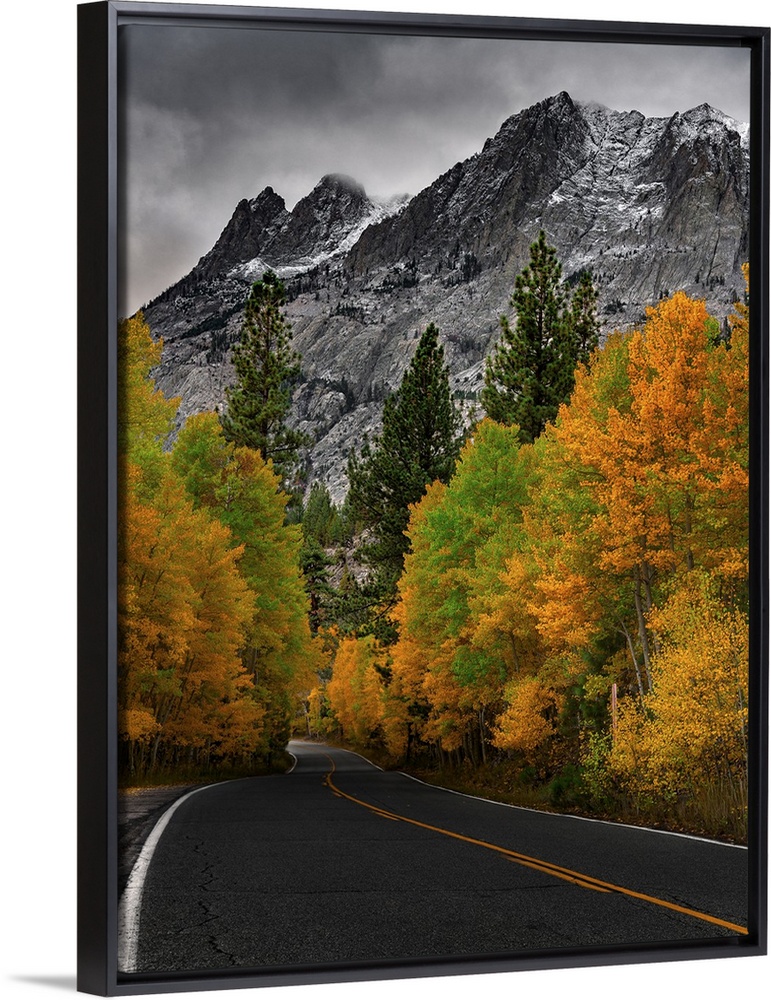 <p>A curving blacktop framed with a blaze of Autumn trees takes the eye into beautiful snow capped Sierra Mountains under low hanging dramatic clouds.</p>