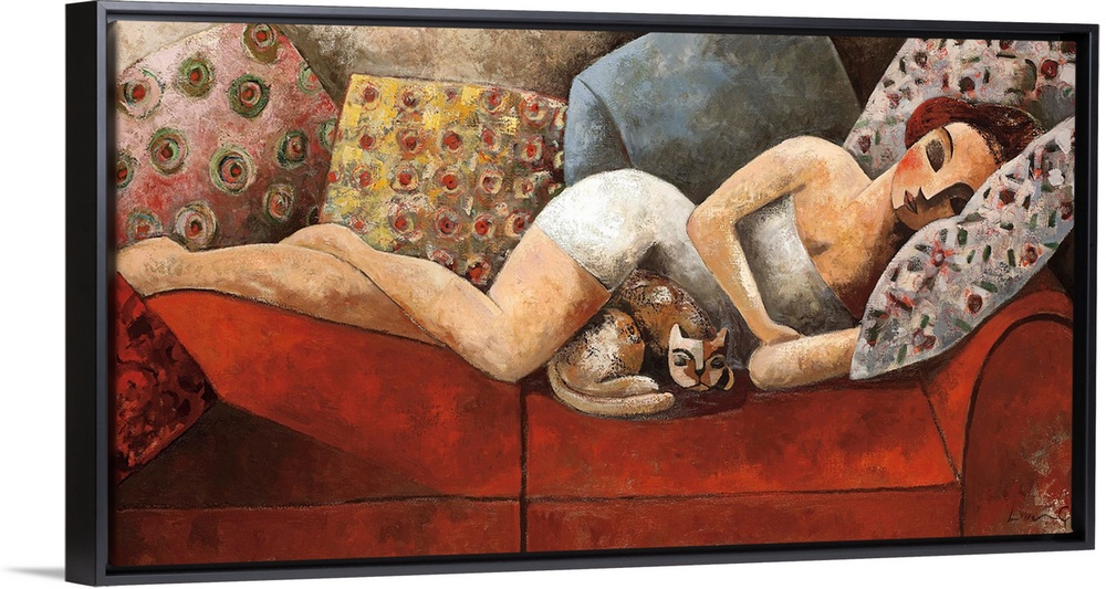 <p>A horizontal portrait of a woman laying on a red couch with a cat, painted with cubism elements.</p>
