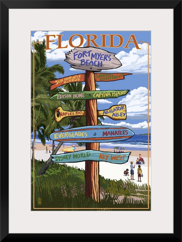 <p>Retro stylized art poster of a sign post showing multiple directions.</p>