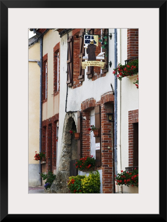<p>A wrouight iron painted sign that illustrates the theme of champagne and wine production: showing a monk looking out of a window and a village hose on a street decorated with many colourful flowers , the village of Hautvillers in Vallee de la Marne , Champagne, Marne, Ardennes, France</p>