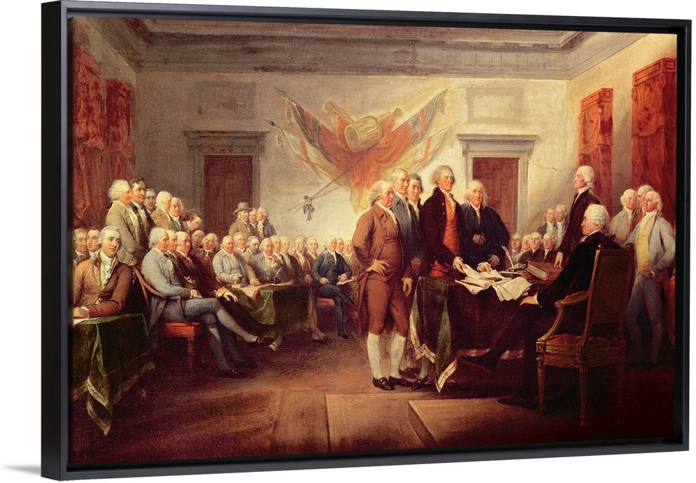 <p>Big classic art portrays the meeting of the Continental Congress in the later part of the 18th century as they prepare to sign and set forth a statement announcing the thirteen American colonies being regarded as 13 newly independent sovereign states and no longer a part of the British Empire. Located within this canvas art, the notable "Committee of Five" consisting of John Adams, Benjamin Franklin, Thomas Jefferson, Robert R. Livingston, and Roger Sherman can be seen issuing their draft of this document.</p>