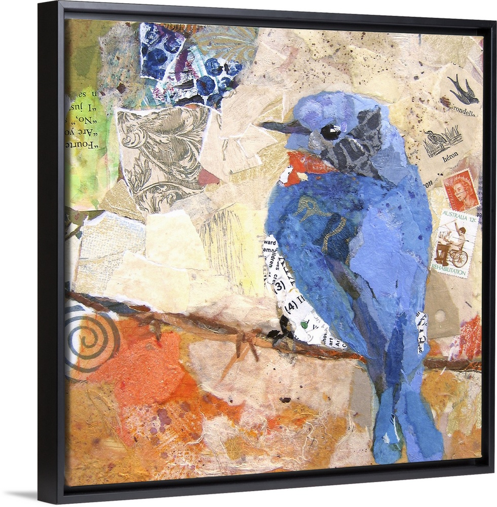 <p>Creative collage of a blue bird perched on a branch with pieces with text and postage stamps.</p>