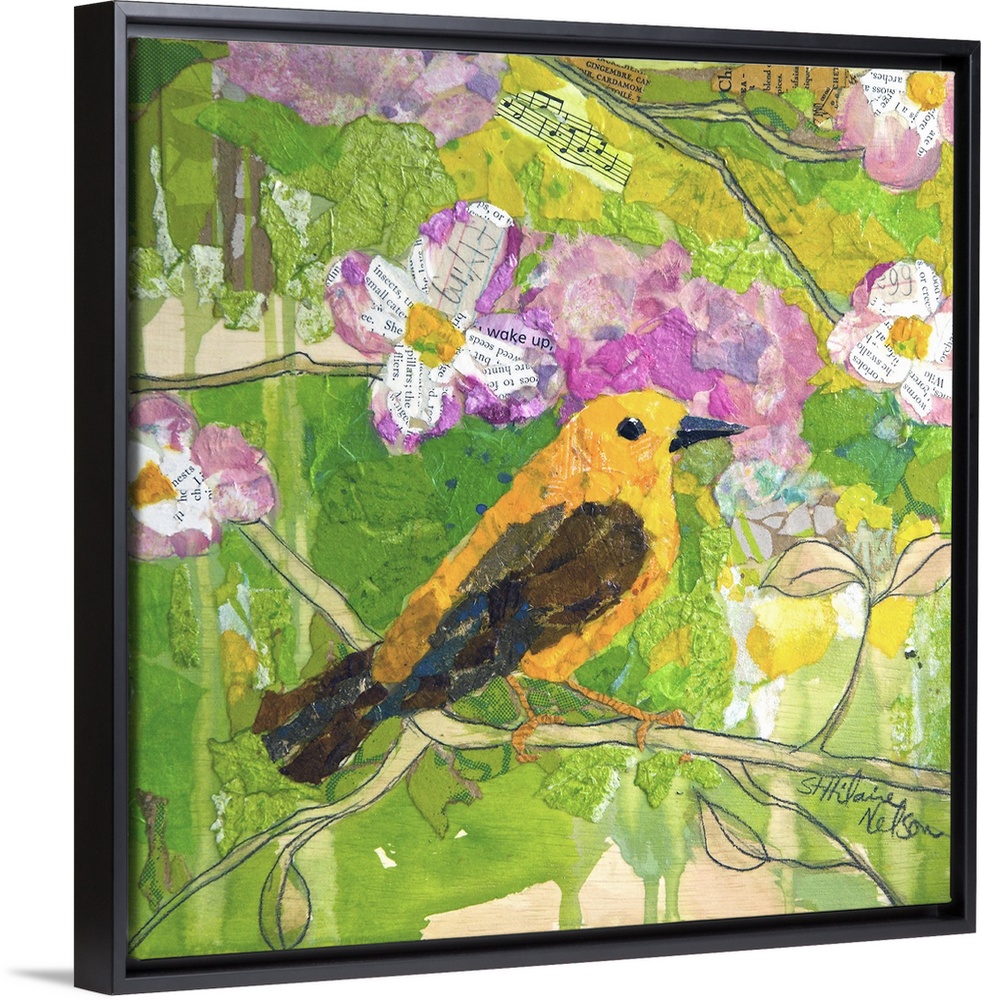 <p>Creative collage of a yellow bird perched on a branch with pieces with text and sheet music.</p>